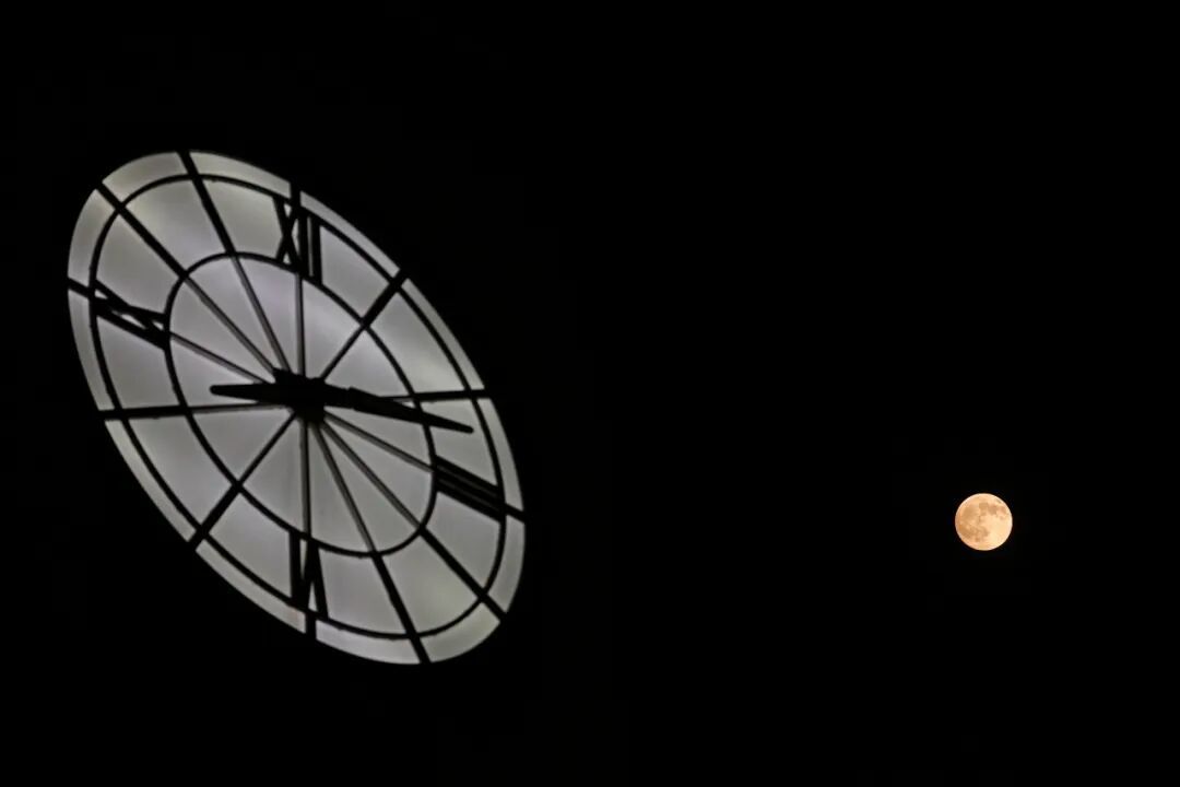 10月6日在江苏海安拍摄的圆月和钟楼。 新华社发(顾彬斌摄)